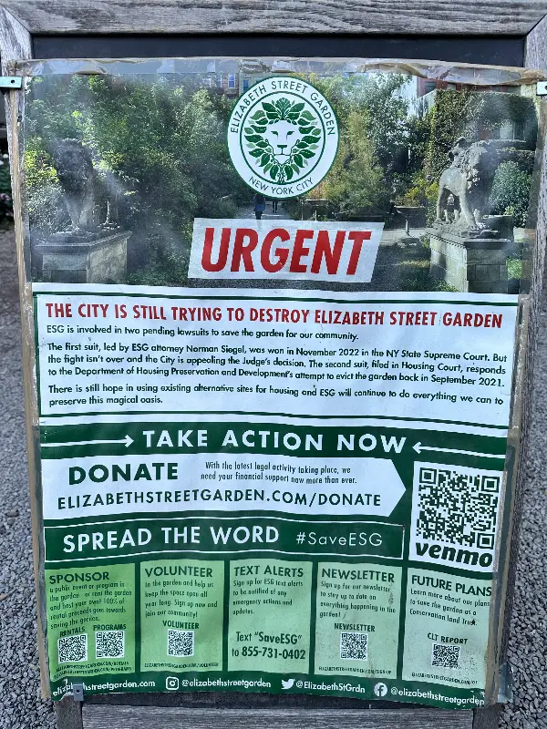 엘리자베스 스트리트 가든은 단순한 공원을 넘어, 뉴욕 시민들에게 소중한 휴식 공간이자 문화 공간입니다. 하지만 최근, 이 아름다운 공간을 없애고 높은 건물을 지으려는 계획이 있다는 소식을 접했습니다. 이는 지역 사회에 큰 손실이 될 것이라고 생각합니다.