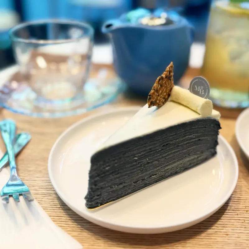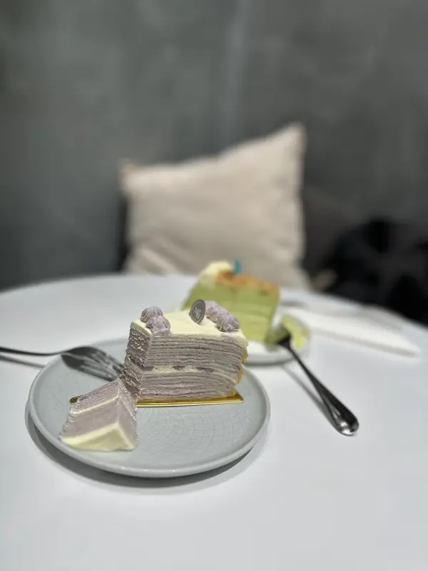 테이블 위에 놓인 타로 밀 크레페 케이크는 은은한 색감으로 시선을 사로잡고, 부드러운 크림은 달콤한 휴식을 예고하는 듯하다.