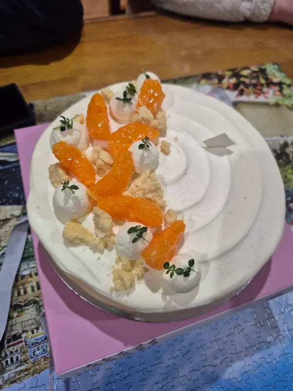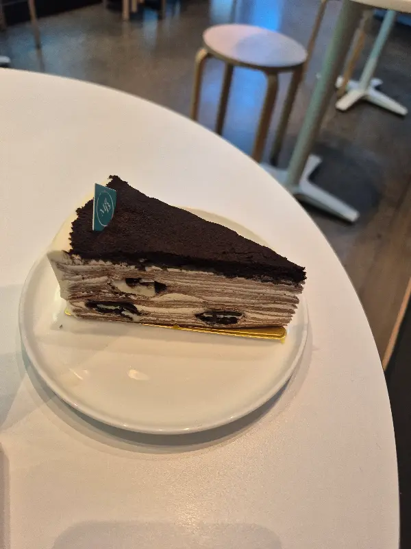 주문한 케이크와 마카롱이 테이블에 놓이자, 그 아름다운 비주얼에 감탄사가 절로 나왔다. 얇게 구워진 크레페 시트가 겹겹이 쌓여 만들어낸 섬세한 모습은, 마치 정교한 공예품을 보는 듯했다. 타로 밀 크레페 케이크는 은은한 보랏빛 색감이 매력적이었고, 얼그레이 다크 초콜릿 마카롱은 짙은 초콜릿 색상과 은은한 얼그레이 향이 조화롭게 어우러졌다.