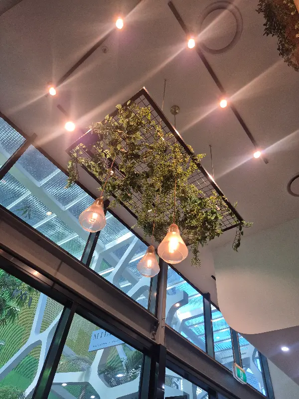 천장에 매달린 조명과 식물 장식은 아늑한 분위기를 더하고, 편안한 휴식을 선사한다.