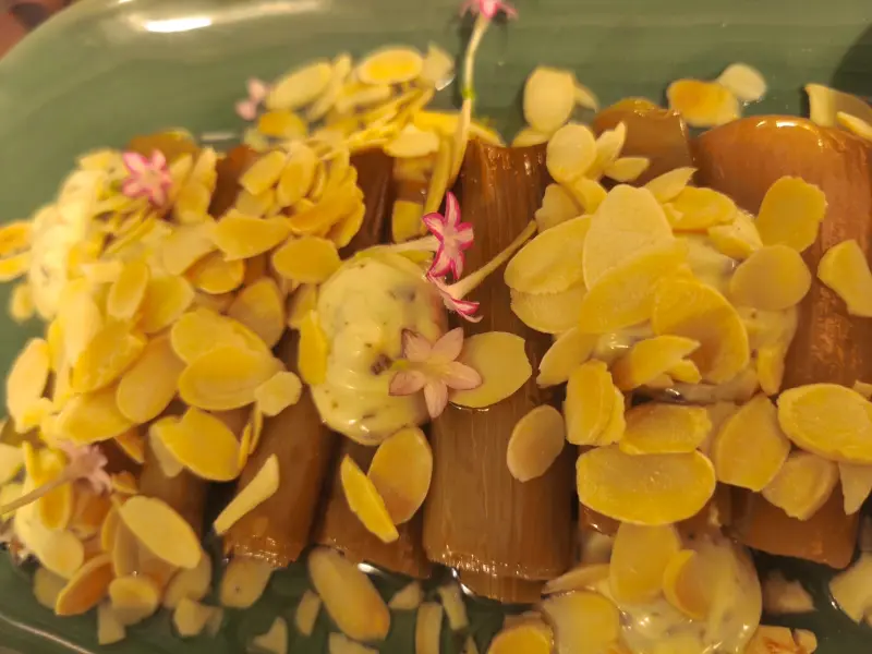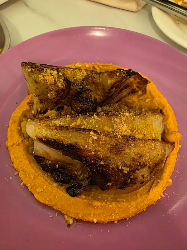 고민 끝에 추천받은 메뉴 몇 가지와 시원한 맥주를 주문했다. 잠시 후, 테이블 위로 하나둘씩 음식이 놓이기 시작했다. 가장 먼저 눈에 들어온 것은 보라색 접시에 담긴 타파스였다. 구운 양배추가 주재료인 듯했고, 독특한 소스와 견과류가 뿌려져 있었다. 한 입 베어 무는 순간, 입 안 가득 퍼지는 풍미에 감탄했다.