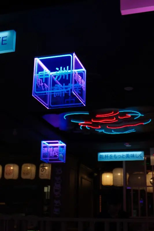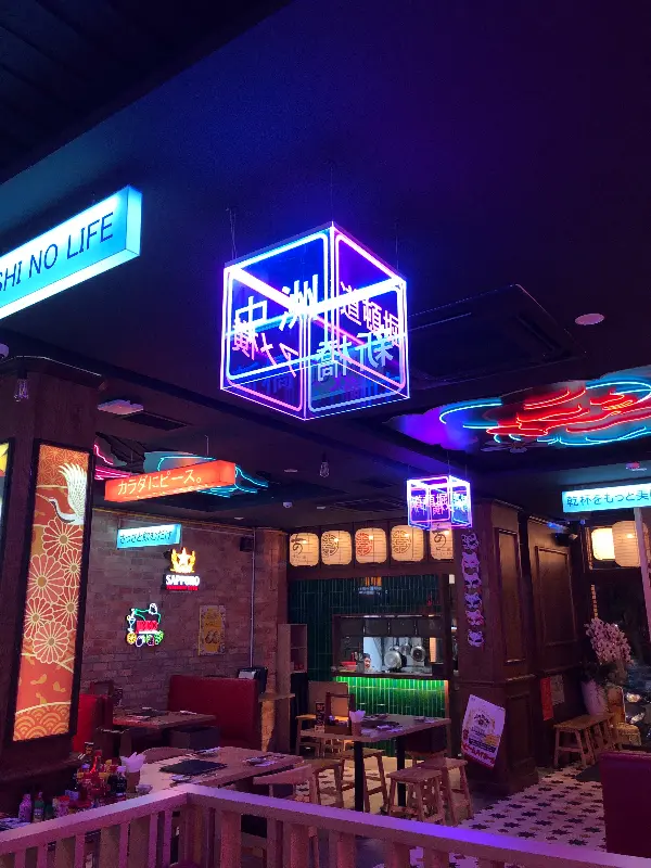천장에는 일본어가 적힌 네온사인 큐브들이 매달려 빛을 발하고 있었고, 벽돌로 마감된 벽면에는 다양한 일본 술병과 포스터가 장식되어 있었다. 테이블 간 간격도 넓어서 편안하게 식사를 즐길 수 있을 것 같았다. 1군 지점과는 달리 손님이 많지 않아 조용하고 한적한 분위기 또한 마음에 들었다.