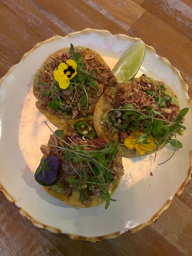 Santo Remedio의 또 다른 인기 메뉴는 참치 토스타다이다. 바삭하게 튀겨진 토르티야 위에 신선한 참치와 아보카도, 그리고 매콤한 소스가 듬뿍 올려져 있었다.
