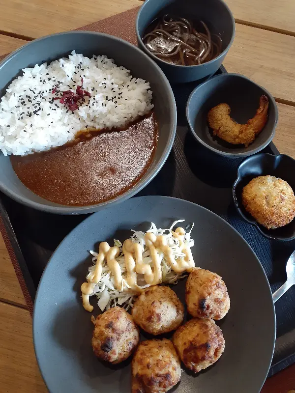 카레라이스 정식, 푸짐한 양과 다양한 곁들임 메뉴가 눈길을 사로잡습니다.