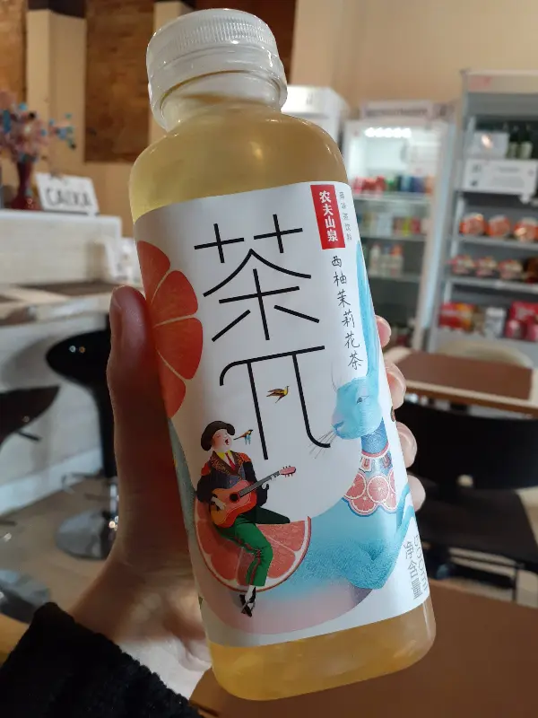 독특한 디자인의 음료수 병, 일본 현지의 느낌을 더합니다.