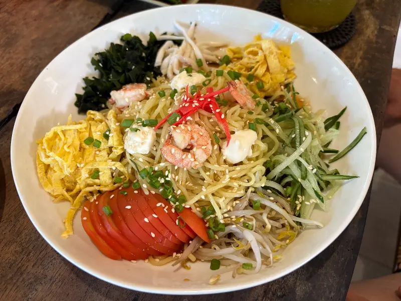 들깨 소스의 고소함이 특별한 와룽의 중국 냉면. 신선한 해산물과 채소가 어우러져 다채로운 맛을 선사한다.