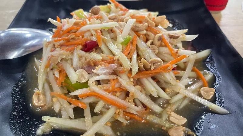 가장 먼저 나온 것은 쏨땀이었습니다. 채 썬 그린 파파야와 토마토, 땅콩, 라임 등을 넣고 매콤하게 버무린 태국식 샐러드인데, 신선한 재료들의 조화가 정말 훌륭했습니다. 특히, 톡톡 터지는 땅콩의 고소함과 라임의 상큼함이 매콤한 양념과 어우러져 입맛을 돋우는 역할을 톡톡히 했습니다. 사진에서 보이는 것처럼 채소의 신선함이 그대로 느껴졌습니다.