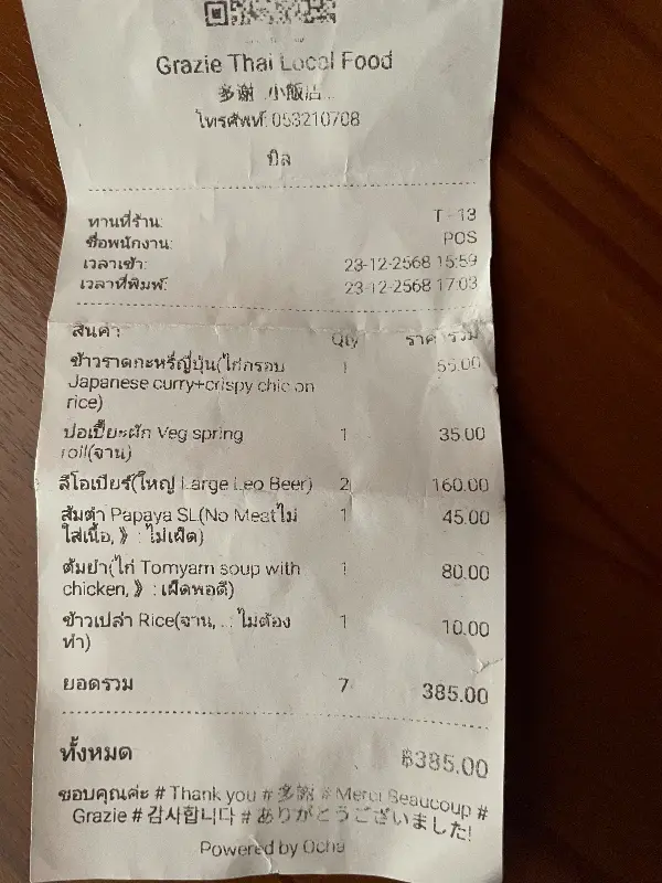 이 식당의 가장 큰 매력 중 하나는 바로 친절한 서비스였습니다. 직원분들은 항상 웃는 얼굴로 손님들을 맞이했고, 필요한 것이 없는지 세심하게 챙겨주셨습니다. 음식이 입에 맞는지 물어봐 주시고, 태국어로 “맛있다”는 표현도 알려주셨습니다. 숙소와 거리가 조금 있었지만, 이들의 친절함에 감동받아 두 번이나 방문하게 되었습니다.