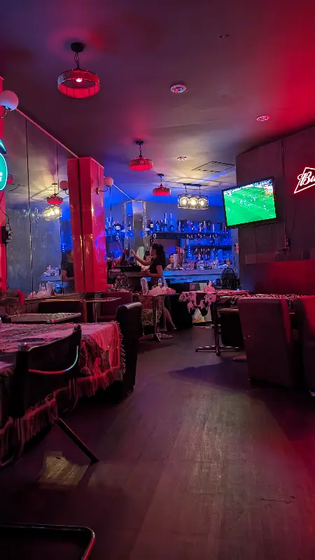 붉은 조명이 강렬한 인상을 남기는 바 내부. 네온사인과 미러볼이 90년대 분위기를 더욱 돋보이게 한다.