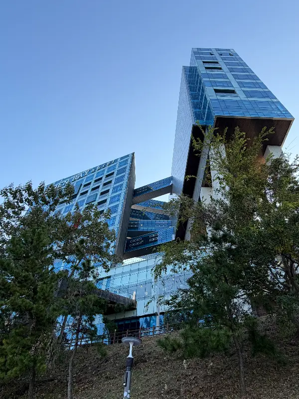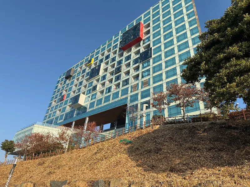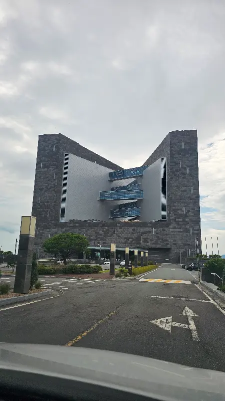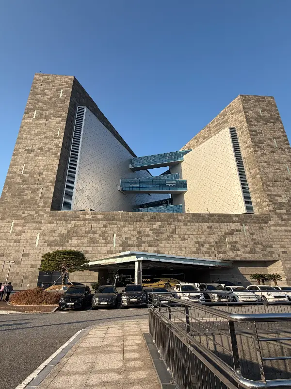 호텔에 도착하자마자 웅장한 외관에 압도당했다. 마치 현대 미술관을 연상시키는 독특한 디자인은, 주변의 푸른 바다와 완벽하게 조화를 이루며 한 폭의 그림 같은 풍경을 만들어냈다. 회색빛 석재와 푸른 유리창의 조화가 세련되면서도 묵직한 분위기를 자아냈다.