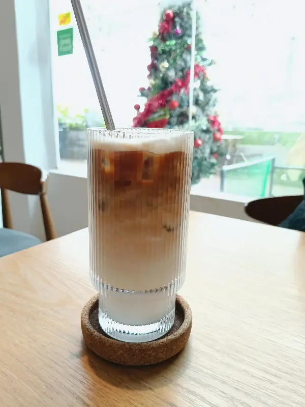 깔끔한 유리잔에 담겨 나오는 아이스 라떼. 코스터 하나에도 세심함이 느껴집니다.