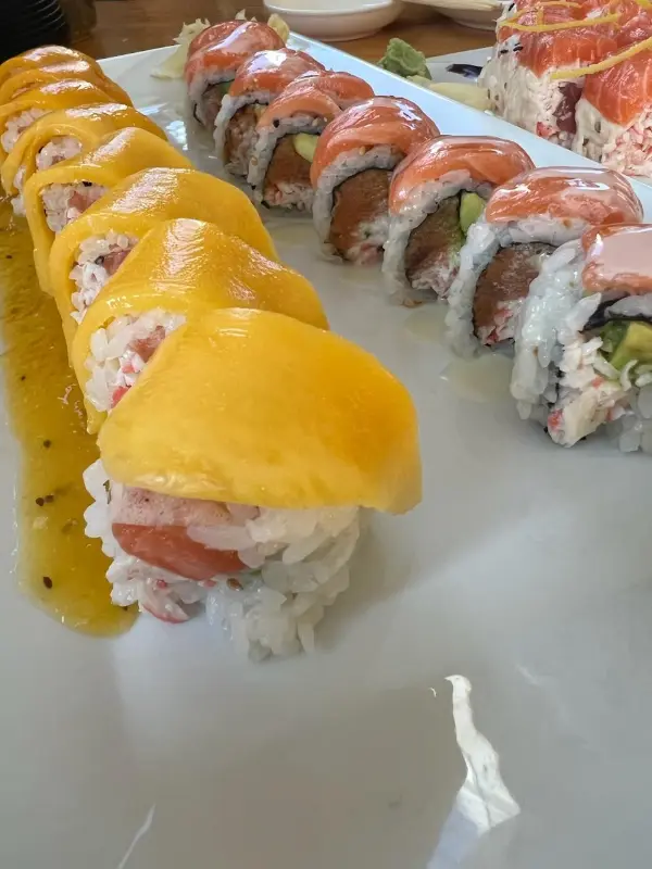 아스카 스시의 인기 메뉴 중 하나인 알로하 롤. 망고의 달콤함이 스시와 절묘하게 어우러집니다.
