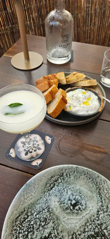 또 다른 메뉴인 Tzatziki는 신선한 오이와 요거트, 마늘이 어우러진 그리스 전통 소스였다. 빵 위에 듬뿍 올려 먹으니, 상큼하면서도 시원한 맛이 입안을 가득 채웠다. 짭짤한 음식들과 함께 곁들이니, 입안이 깔끔하게 정리되는 느낌이었다.