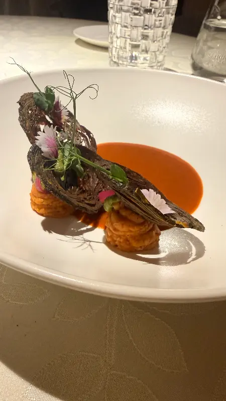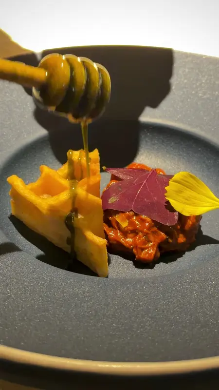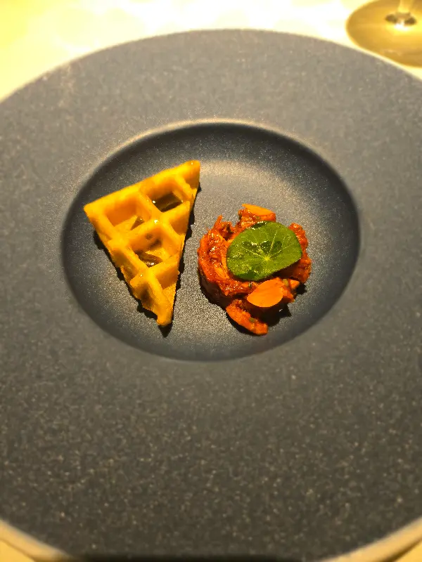 트레신드의 요리들은 맛뿐만 아니라 플레이팅 또한 예술적이었다. 각 요리의 특성을 살린 섬세한 장식들은 마치 한 폭의 그림을 보는 듯했다. 특히 기억에 남는 것은, 작은 와플 조각 옆에 정갈하게 놓인 채소 볶음 위에 싱그러운 잎사귀를 살짝 올려놓은 모습이었다. 푸른색 접시 위에 놓인 노란색 와플과 붉은색 채소 볶음의 조화는 시각적인 아름다움을 극대화했다.