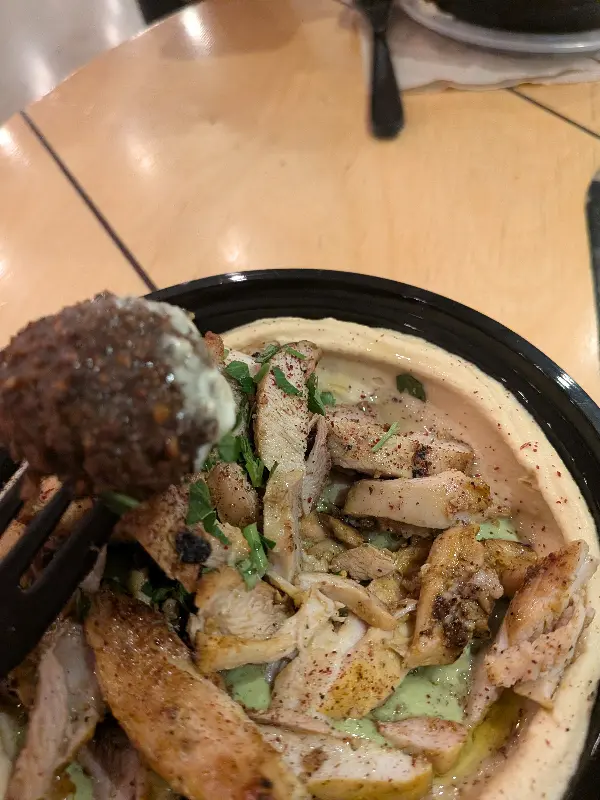 고민 끝에 선택한 메뉴는 샤와르마 볼. 촉촉하고 부드러운 치킨과 신선한 채소가 어우러진 비주얼은, 보기만 해도 군침이 돌았다.