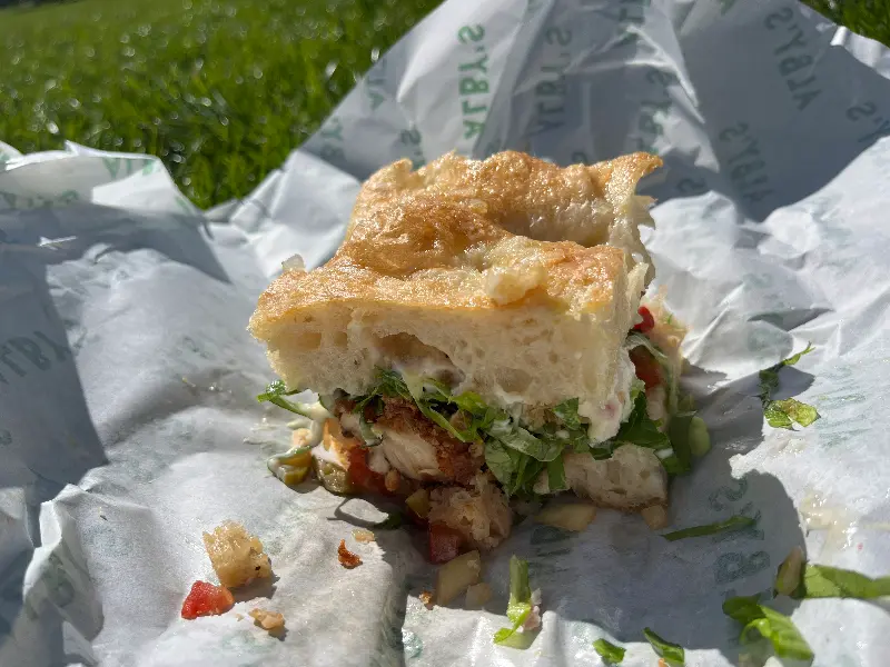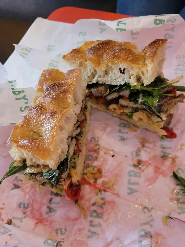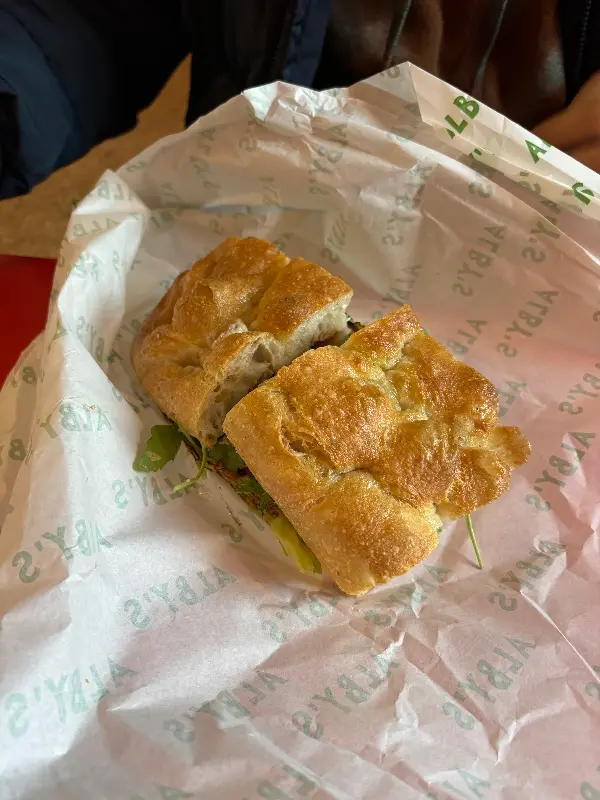 사진 속 샌드위치는 윤기가 흐르는 빵과 신선한 채소, 먹음직스러운 속 재료들이 층층이 쌓여 보는 이의 식욕을 자극합니다. Alba’s의 샌드위치는 단순한 음식이 아닌, 정성 들여 만든 예술 작품과 같습니다.