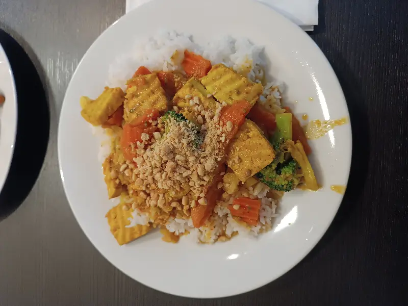 사진 속 채식 카레는 큼직하게 썰린 두부와 당근, 브로콜리 등 다양한 채소가 밥 위에 얹어져 있다. 알록달록한 색감은 보기에도 즐거움을 더하며, 건강한 한 끼 식사를 제공한다.