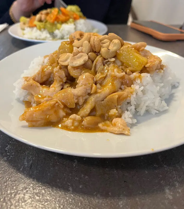 카레 위에 듬뿍 올려진 캐슈넛과 땅콩은 고소한 풍미를 더하며, 매콤한 카레 소스와 환상적인 조화를 이룬다. 한 입 먹는 순간, 입안 가득 퍼지는 풍부한 맛에 행복감을 느낄 수 있다.