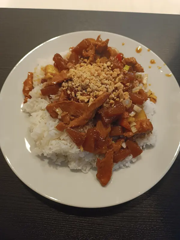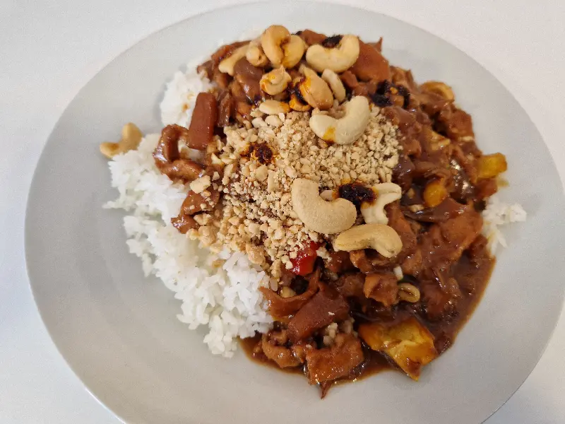 이미지 속 닭고기 카레는 윤기가 흐르는 갈색 소스와 큼직한 닭고기 조각, 그리고 밥 위에 뿌려진 땅콩 토핑이 인상적이다. 한눈에 보기에도 먹음직스러운 비주얼은 식욕을 자극하며, 카레의 깊은 풍미를 기대하게 만든다.