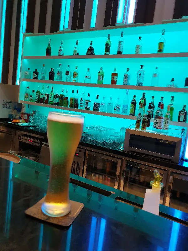 라운지에 들어서면 가장 먼저 눈에 띄는 것은 감각적인 인테리어입니다. 특히 푸른색 조명이 비추는 바 테이블은 시선을 사로잡으며, 그 뒤로 늘어선 다양한 종류의 술병들은 이곳이 단순한 맥주집이 아닌, 제대로 된 라운지임을 짐작하게 합니다. 벽면의 독특한 장식과 은은한 조명은 공간 전체에 세련되면서도 편안한 분위기를 더합니다. 마치 푸켓의 숨겨진 오아시스 같은 느낌을 자아냅니다.