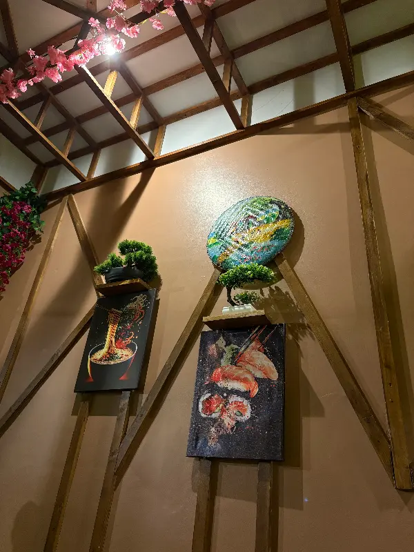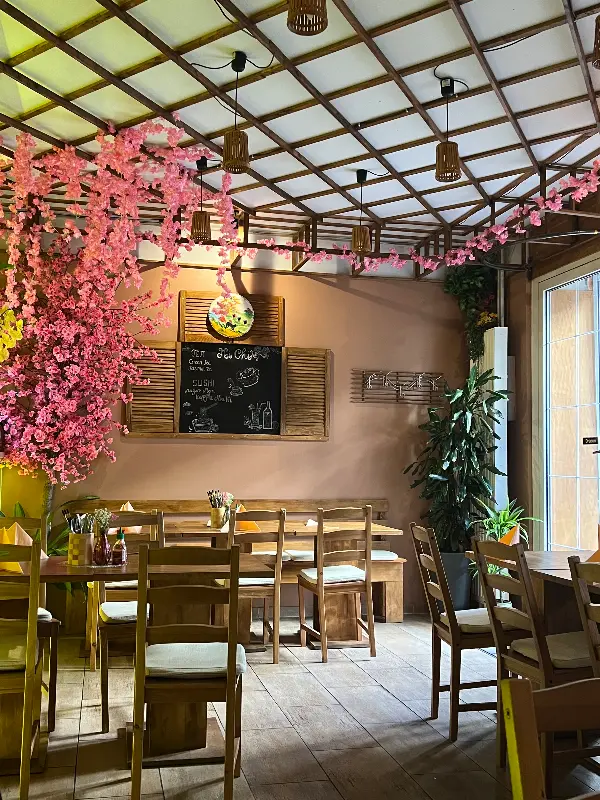 천장에는 벚꽃 장식이 늘어져 있어 화사함을 더하고, 벽에는 아기자기한 그림과 소품들이 걸려 있어 구경하는 재미도 쏠쏠합니다. 마치 작은 정원에 들어온 듯한 느낌을 주는 초록 식물들도 공간 곳곳에 배치되어 있어 싱그러움을 더합니다. 사진에서 보이는 것처럼 천장의 격자무늬와 나무 소재, 그리고 핑크빛 벚꽃 장식이 어우러져 독특하면서도 편안한 분위기를 자아냅니다.