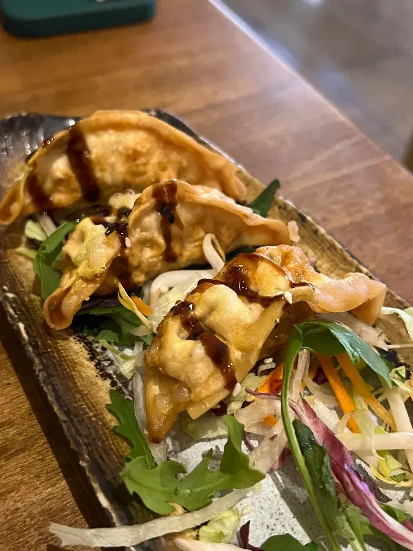 겉은 바삭하고 속은 촉촉한 만두. 신선한 채소와 함께 제공되어 더욱 맛있습니다.