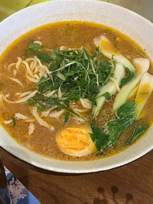 따뜻한 국물과 신선한 채소가 어우러진 면 요리. 추운 날씨에 몸을 녹여주는 든든한 한 끼 식사입니다.