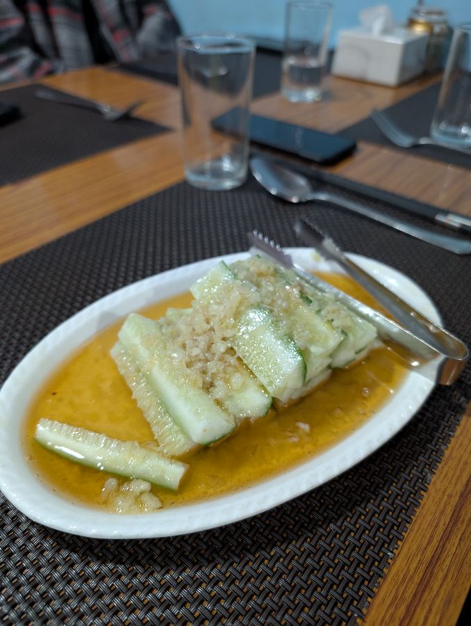 신선한 오이로 만든 샐러드는 리뷰에서 언급된 ‘아차르’와는 또 다른 매력으로 미각을 자극했다. 잘게 썬 오이 위에 다진 마늘이 듬뿍 올라가 있고, 새콤달콤한 소스가 뿌려져 있어 깔끔하면서도 상큼한 맛이 일품이었다. 메인 요리를 기다리는 동안 입안을 개운하게 정돈해주어 식사의 기대감을 한층 더 높였다. 투명한 유리잔에 담긴 시원한 물 한 잔과 함께 가벼운 이야기들을 나누며, 앞으로 펼쳐질 미식의 향연을 설레는 마음으로 기다렸다.