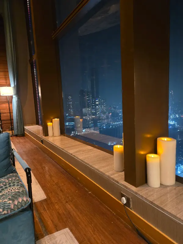 레스토랑에 들어서자마자 탄성이 절로 나왔다. 통유리창 너머로 펼쳐진 뭄바이의 야경은 그야말로 장관이었다. 반짝이는 도시의 불빛들이 마치 하늘에 수놓은 별처럼 아름다웠다. 창가 좌석에는 이미 캔들이 은은하게 밝혀져 있었고, 로맨틱한 분위기를 더했다. 마치 영화 속 주인공이 된 듯한 기분이었다. 창가 자리에 앉으니 도시의 야경이 한눈에 들어와 더욱 황홀했다.