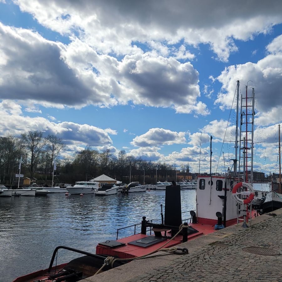 스톡홀름의 아름다운 항구 풍경이 레스토랑 주변의 평화로운 분위기를 더해줍니다.
