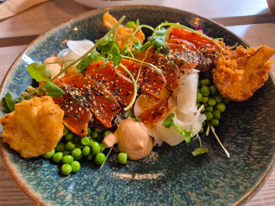가장 먼저 마음을 사로잡은 메뉴는 단연 스파이시 살몬(Spicy Salmon)이었습니다. 이름처럼 매콤한 맛을 기대했지만, 실제로 맛본 스파이시 살몬은 그 이상이었습니다. 타다키 스타일로 겉만 살짝 익혀낸 연어는 부드러운 속살과 고소한 겉면의 조화가 일품이었습니다. 새콤달콤하면서도 살짝 매콤한 소스가 연어의 풍미를 더욱 돋보이게 했고, 곁들여 나온 바삭하게 튀긴 콜리플라워는 예상치 못한 환상의 궁합을 자랑했습니다. 한 입 베어 물 때마다 터지는 연어의 신선함과 소스의 감칠맛, 그리고 콜리플라워의 고소한 바삭함이 어우러져 입안 가득 행복감이 밀려왔습니다. 푸릇푸릇한 완두콩과 어린잎 채소들이 접시 위에서 색감을 더하며 미각뿐 아니라 시각적으로도 만족스러운 경험을 선사했습니다.