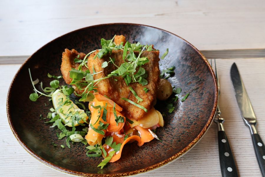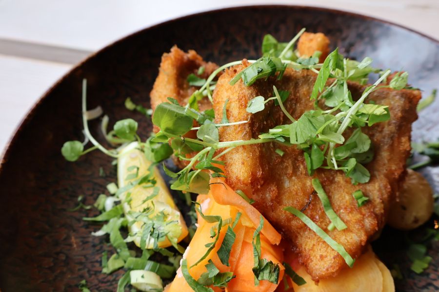 바삭한 크리스피 피시와 다채로운 색감의 가니쉬가 정갈한 접시에 담겨 있습니다.