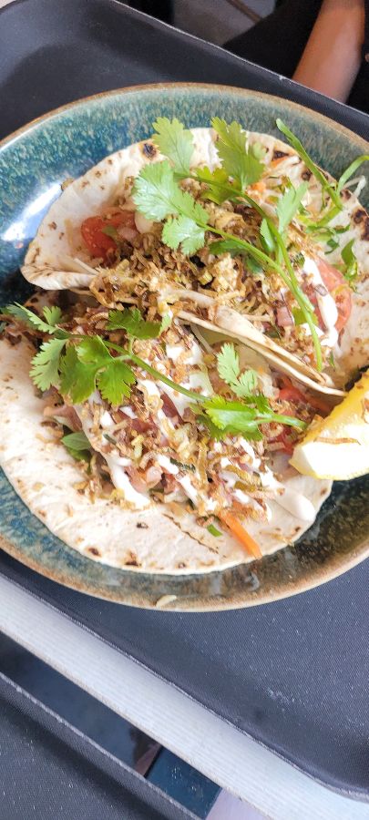 바삭한 생선살과 신선한 채소, 소스가 어우러진 독특한 스타일의 피시 타코입니다.