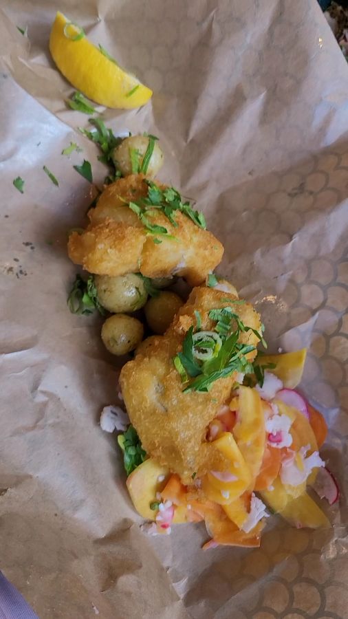 크리스피 피시와 곁들여진 미니 감자, 신선한 야채가 캐주얼한 종이 포장에 담겨있습니다.