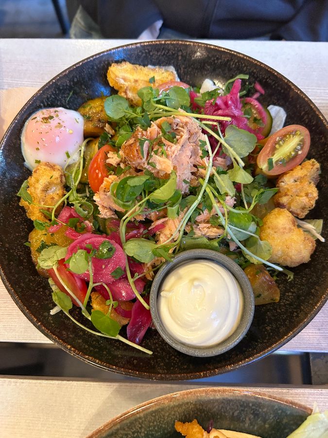 매콤한 연어와 신선한 채소, 튀긴 콜리플라워가 아름답게 플레이팅된 모습입니다.