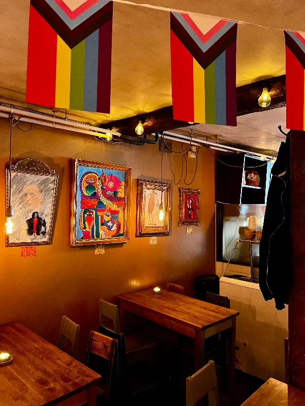 천장에는 알록달록한 깃발들이 장식되어 있어 자유로운 분위기를 더했고, 나무 테이블과 의자는 편안함을 선사했다. 한쪽 벽면에는 스웨덴의 전통적인 패턴이 그려져 있어 현지 분위기를 물씬 풍겼다. 테이블 간 간격이 조금 좁은 듯했지만, 오히려 그 덕분에 더욱 활기찬 분위기를 느낄 수 있었다. 마치 북유럽 영화 속에 들어온 듯한 기분이었다.