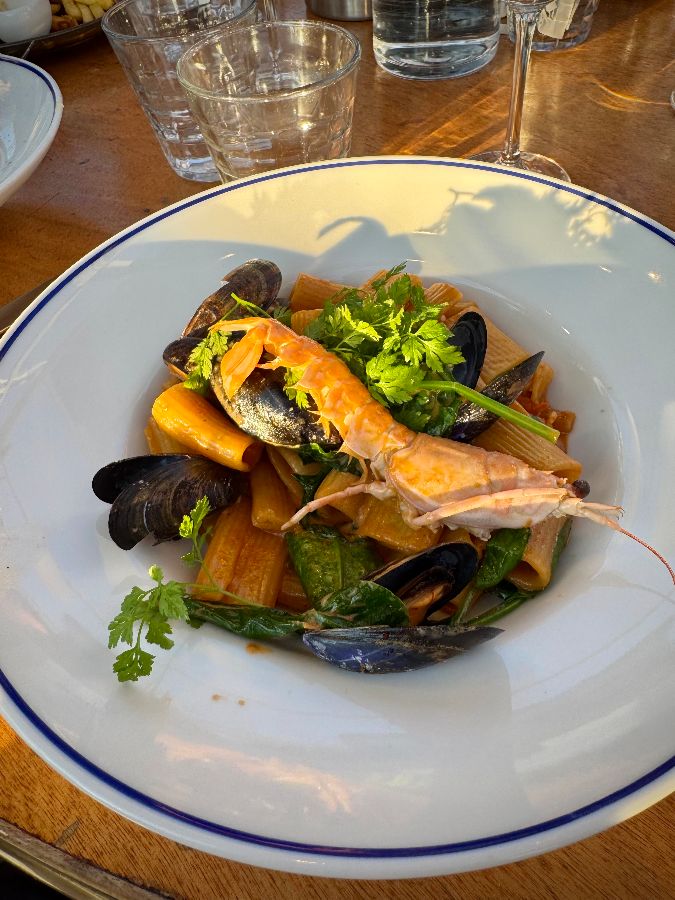 옹바츠브리간의 메뉴는 신선한 제철 재료와 셰프의 정성이 깃든 요리로 가득합니다. 특히 해산물 파스타는 이곳의 자랑스러운 시그니처 메뉴 중 하나입니다. 완벽하게 삶아진 파스타 면은 입안에서 춤을 추듯 부드럽게 감기며, 신선한 홍합과 함께 은은한 바다 향을 선사합니다. 한 입 가득 느껴지는 조화로운 맛은 방문객들을 감탄하게 만듭니다. 이탈리아인 방문객조차 “정성껏 준비된 음식부터 따뜻하고 세심한 서비스까지, 한결같이 고급스러운 경험을 선사한다”고 극찬할 정도입니다. 가볍게 즐길 수 있는 새우 샐러드와 토스트는 애피타이저로 제격이며, 상큼한 레몬 조각이 신선함을 더해줍니다.