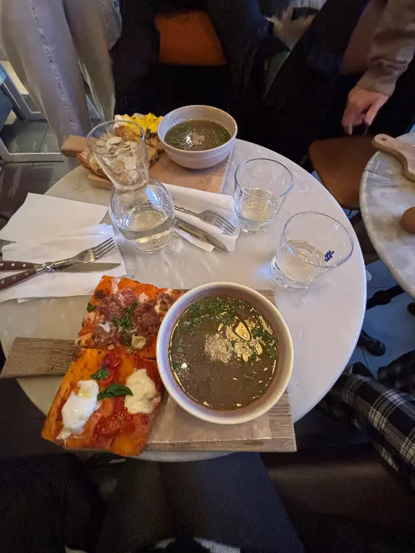 다른 날 방문했을 때는 버섯 수프를 맛보았는데, 신선한 버섯의 풍미가 그대로 느껴지는 깊고 진한 맛이 일품이었다. 특히, 수프와 함께 제공되는 포카치아는 겉은 바삭하고 속은 촉촉해서 수프와 환상적인 조화를 이루었다. The Two Italians에서는 피자뿐만 아니라 수프 또한 훌륭한 선택이 될 것이다.
