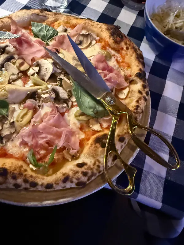 피자와 함께 제공되는 독특한 가위. 바삭한 피자를 깔끔하게 잘라 먹을 수 있다.