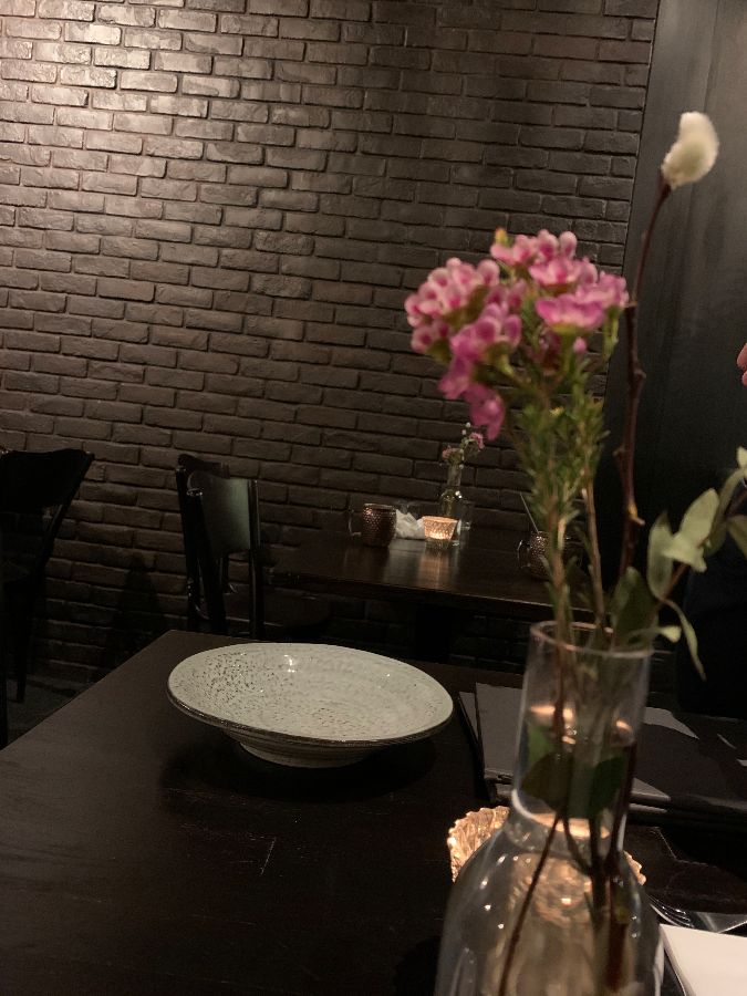 나마스카르는 전형적인 인도 레스토랑과는 사뭇 다른 분위기를 풍겼다. 화려한 장식 대신 어둡고 소박한 인테리어가 오히려 편안함을 주었고, 깔끔하게 정돈된 테이블은 기대감을 높였다. 벽돌 질감의 벽과 은은한 조명 아래 놓인 꽃병은 공간에 생기를 불어넣었다. 한쪽 벽면에는 다양한 술병들이 진열되어 있어, 바(Bar)의 분위기도 살짝 느껴졌다.