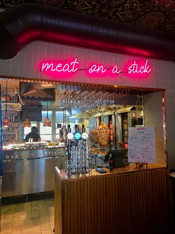 가게에 들어서자마자 강렬한 네온사인 간판이 눈에 띄었다. 붉은색 네온으로 쓰여진 “meat on a stick”이라는 문구가 인상적이었다.