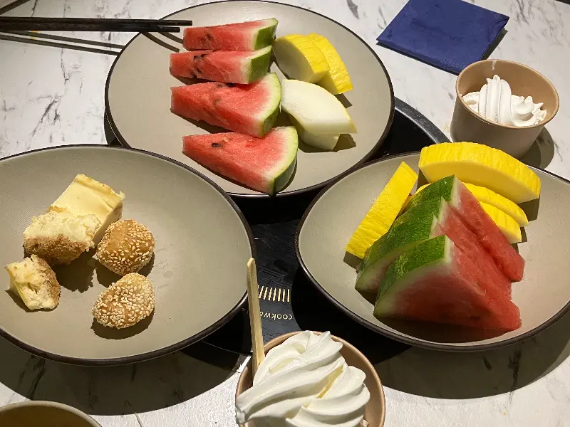 배부르게 훠궈를 즐긴 후에는 디저트 코너로 향합니다. 아이스크림, 과일, 케이크 등 다양한 디저트가 준비되어 있습니다. 시원한 아이스크림으로 입가심을 하고, 달콤한 과일로 마무리하면 완벽한 식사가 완성됩니다. 특히 아이스크림은 꼭 맛봐야 할 필수 코스입니다!