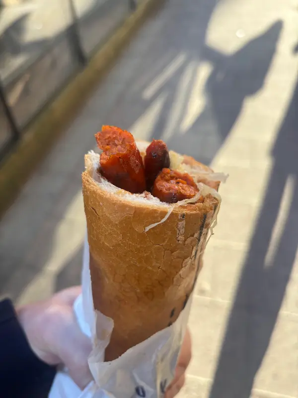 갓 만들어진 핫도그를 들고 근처 벤치로 향했다. 따뜻한 햇볕 아래 핫도그를 한 입 베어 물었다. 빵은 겉은 바삭하고 속은 촉촉했다. 초리조 소시지는 매콤하면서도 짭짤한 맛이 일품이었다. 특히 소시지에서 느껴지는 육즙과 향신료의 조화가 환상적이었다. 양파와 양배추는 신선하고 아삭아삭한 식감을 더해주었다.