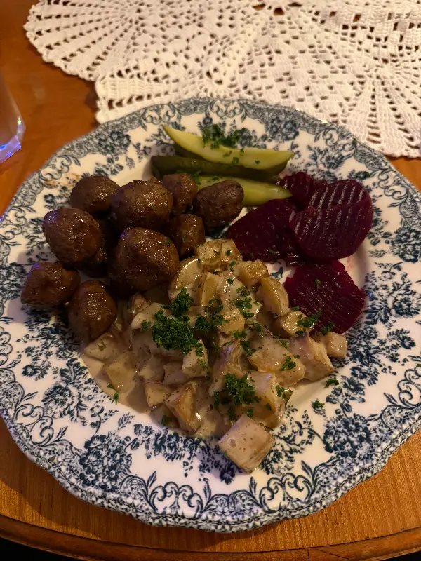 이곳의 대표 메뉴는 단연 무스(Moose, 큰사슴) 미트볼입니다. 스웨덴 전통 음식을 맛볼 수 있다는 기대감에, 저는 망설임 없이 무스 미트볼을 주문했습니다. 잠시 후, 테이블 위에 놓인 접시에는 윤기가 흐르는 미트볼과 으깬 감자, 그리고 링곤베리 잼이 함께 담겨 있었습니다.