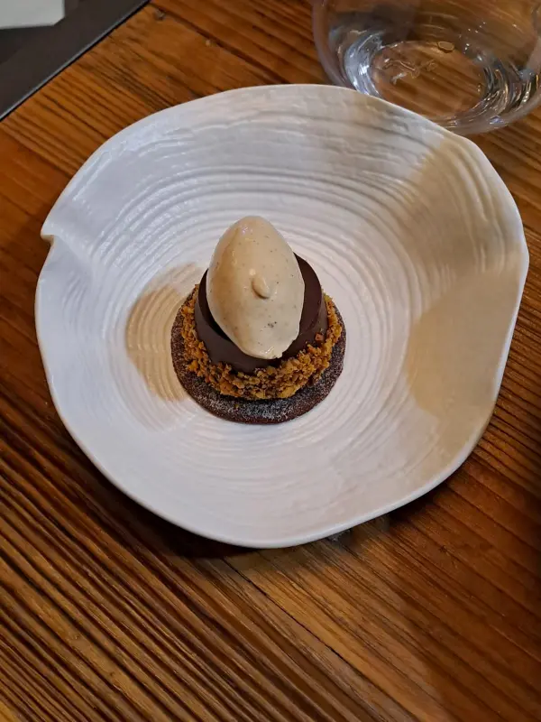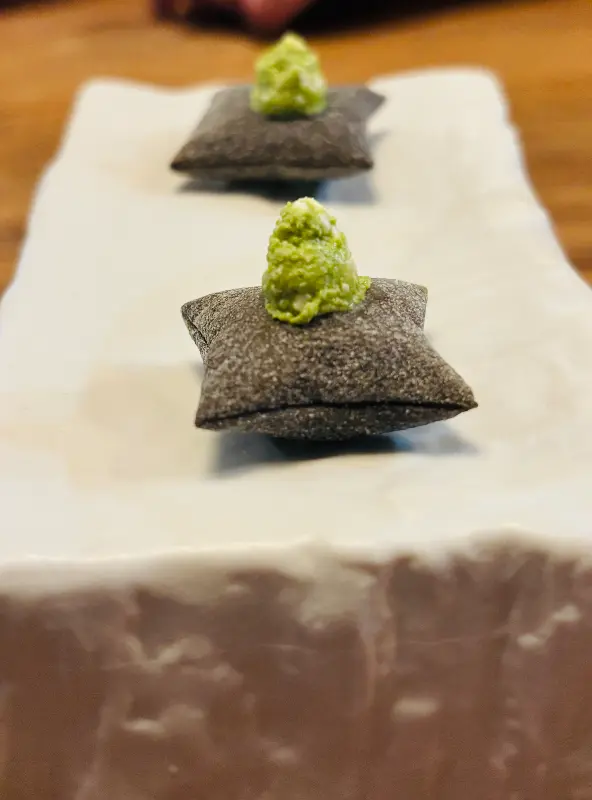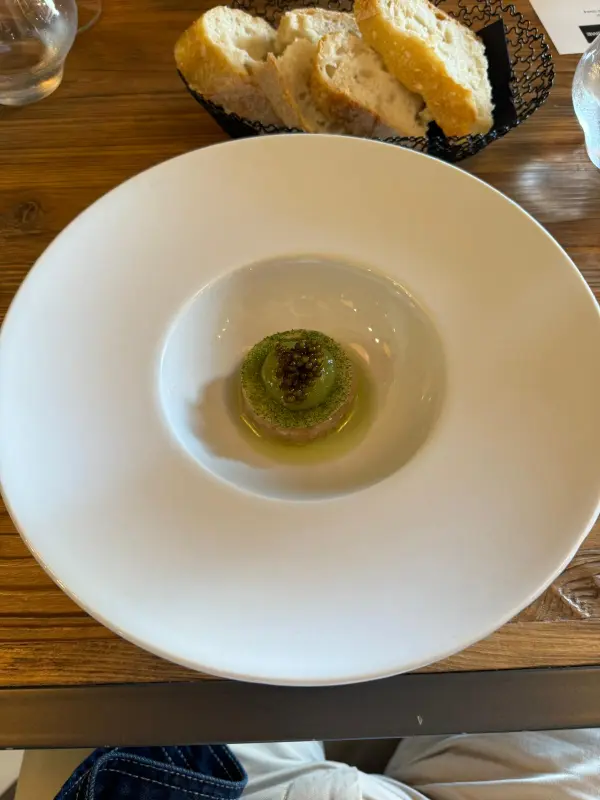 식사의 시작을 알리는 아뮤즈 부쉬가 등장했습니다. 섬세하게 놓인 두 개의 작은 ‘베개’ 위에 살포시 올라간 녹색 빛깔의 소스는 입맛을 돋우는 데 충분했습니다. 첫 입에 느껴지는 신선함과 독특한 풍미는 앞으로 이어질 요리에 대한 기대감을 한층 더 끌어올립니다. 마치 셰프가 선사하는 작은 선물 같습니다.