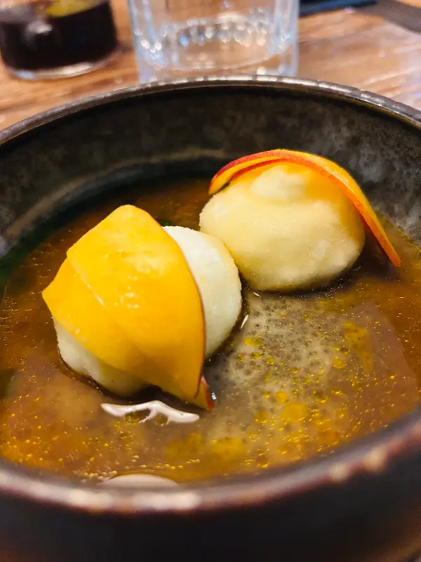 다음으로 등장한 애호박 수프는 마치 햇살을 머금은 듯 옅은 초록빛을 띠고 있습니다. 수프 중앙에 자리 잡은 동그란 튀김 볼은 시각적인 즐거움을 더합니다. 한 스푼 떠서 입에 넣으니, 애호박의 은은한 단맛과 부드러운 질감이 입안 가득 퍼져 나갑니다. 마치 따뜻한 속삭임처럼 위장을 부드럽게 감싸는 느낌입니다.