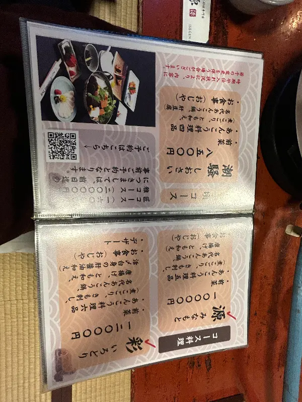 이세 겐의 다양한 코스 메뉴를 소개하는 메뉴판.