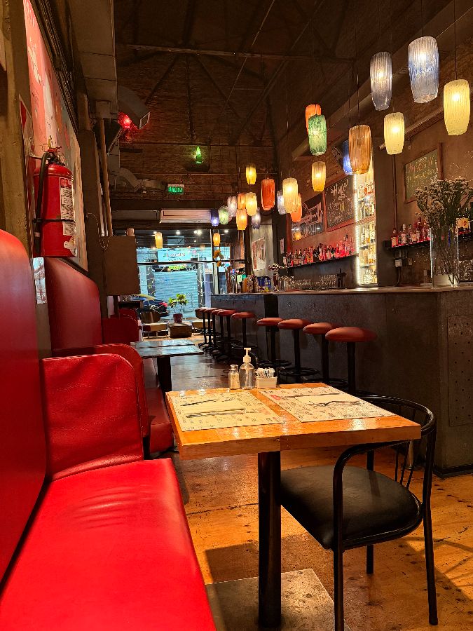 가장 먼저 눈에 들어오는 것은 강렬하면서도 편안한 붉은색 벤치형 소파 좌석입니다. 벽을 따라 길게 놓인 이 좌석들은 마치 오래된 이탈리아 영화의 한 장면처럼 클래식한 분위기를 자아냅니다. 천장에서 내려오는 다양한 색깔의 유리 전등들은 공간 전체에 따뜻하고 부드러운 빛을 드리우며, 마치 작은 별들이 하늘에서 반짝이는 듯한 환상적인 느낌을 줍니다. 바 섹션은 활기찬 대화 소리와 잔 부딪히는 소리로 가득하며, 이곳에서 만들어지는 칵테일들은 또 다른 기대를 품게 합니다. 전반적인 분위기는 “10점 만점에 10점!”이라는 찬사가 아깝지 않을 만큼 매력적입니다. 특히 큰 테이블들이 많아 단체 모임에도 안성맞춤입니다. 다만, 실내 음향은 다소 아쉬울 수 있으나, 만약 정원에 앉을 수 있다면 그 아쉬움마저 사라질 정도로 완벽한 공간을 경험할 수 있다고 합니다.