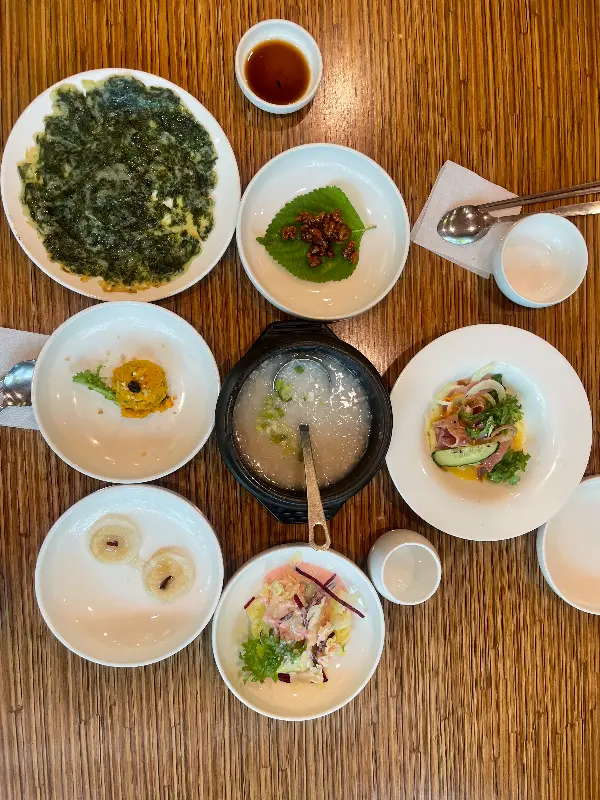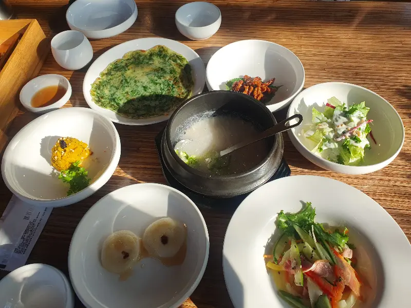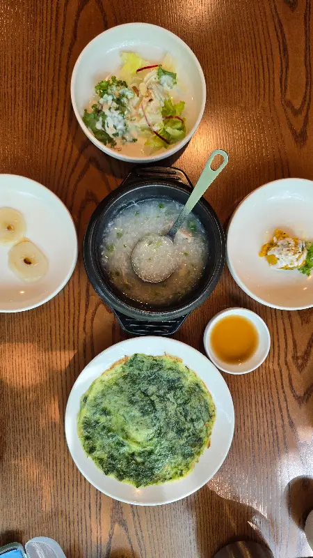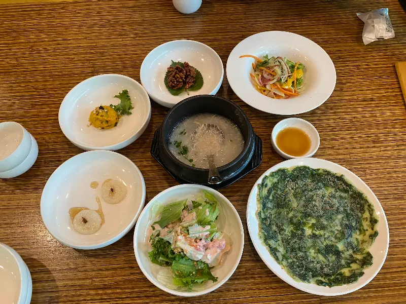 닭죽으로 시작된 식사는, 신선한 샐러드와 슴슴한 맛이 매력적인 물김치로 이어졌다. 특히 인상 깊었던 것은, 짭짤하면서도 감칠맛 넘치는 게장이었다. 윤기가 자르르 흐르는 게살을 입에 넣으니, 입안 가득 퍼지는 풍미가 정말 환상적이었다.