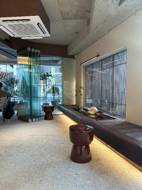 문을 열고 들어서자, 은은하게 퍼지는 조명이 아늑한 분위기를 자아낸다. 높은 천장과 넓은 공간은 답답함 없이 편안한 느낌을 준다. 창밖으로 보이는 작은 정원은 마치 비밀의 숲으로 들어온 듯한 착각을 불러일으킨다. 한옥의 요소가 곳곳에 스며들어 있어 외국인들에게도 매력적인 공간일 듯하다.